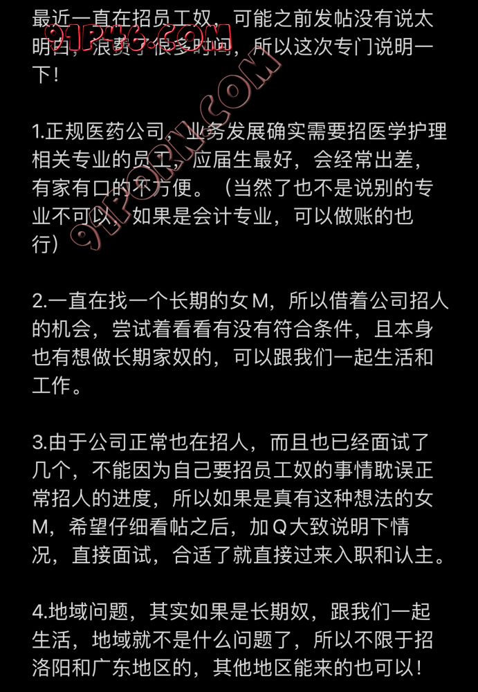 3.由于公司正常也在招人,而且也已经面试了几个,不能因为自己要招员工奴的事情耽误正常招人的进度,所以如果是真有这种想法的女M,希望仔细看帖之后,加Q大致说明下情况,直接面试,合适了就直接过来入职和认主。