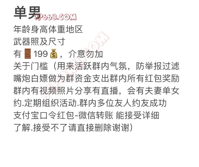 关于门槛:过滤嘴炮白嫖屌丝,作为群资金活跃气氛,群内视频照片分享直播,夫妻单女线下邀约,群内多位成员约友成功