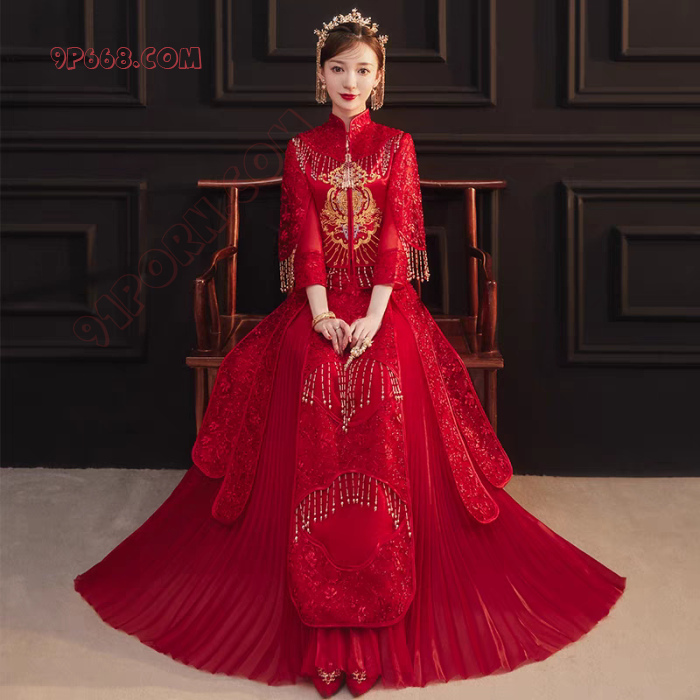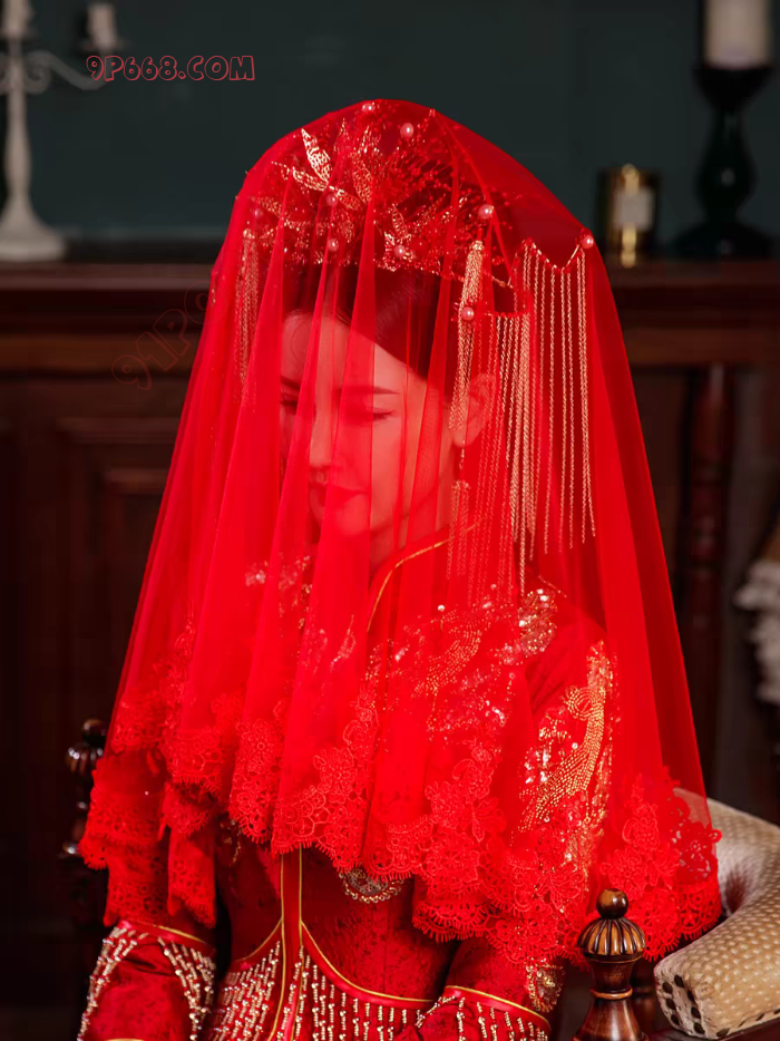 1、把酒店套房装修成新婚房间,“朵朵”新娘身穿“新娘禾秀服”在婚床上,头戴红纱,静静等待新郎入洞房;