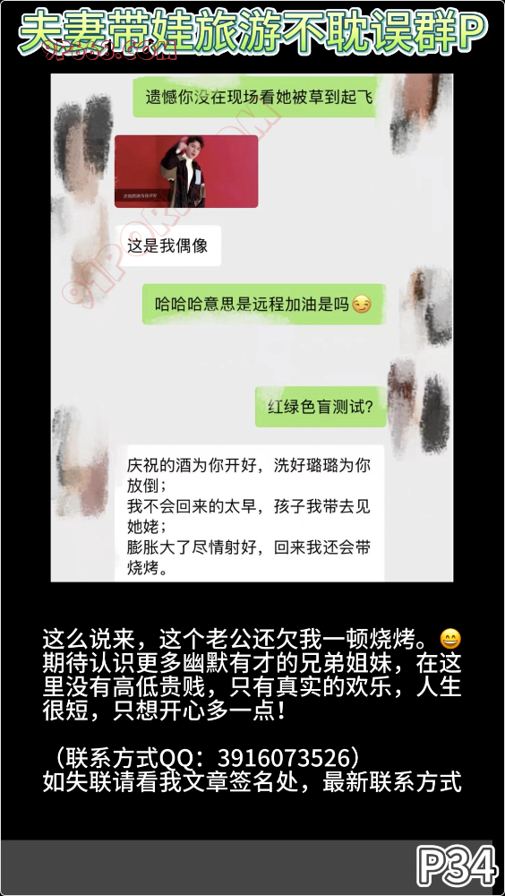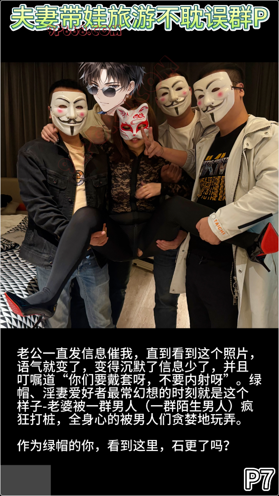 老公一直发信息催我,直到看到这个照片,语气就变了,变得沉默了信息少了,并且叮嘱道“你们要戴套呀,不要内射呀”。绿帽、淫妻爱好者最常幻想的时刻就是这个样子-老婆被一群男人(一群陌生男人)疯狂打桩,全身心的被男人们贪婪地玩弄。